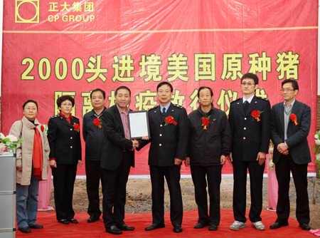 放行儀式上,陝西出入境檢驗檢疫局代表做瞭檢疫放行報告:“經過3個多月的隔離檢驗,正大集團農牧食品企業(中國區)引進的2000頭原種豬完全符合安全檢疫标準,準予放行。”陝西出入境檢驗檢疫局代表爲正大集團陝西區陳強總裁頒發瞭《種豬檢疫合格證書》。
