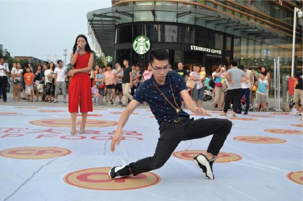 活動時長大約30分鍾,首先快閃人員在王府井南昌路店門口廣場中央集合,穿戴著(zhe)簡單大方、整齊利索的衣物四處遊走在人群中。時間一到,音樂響起,歌手慢慢走近中央,一首振奮人心的“我和你”拉開整個活動的序幕,瞬間引起瞭(le)在場所有人群的關注。緊接著(zhe)舞蹈演員閃亮上場,展開瞭(le)一場激情澎湃的機械舞,帶動現場觀衆情不自禁參與到表演中來,此時人流迅速聚攏,引起圍觀。然後正大食品有限公司員工身著(zhe)公司服裝,唱著(zhe)正大集團《愛是正大無私的奉獻》一起出現在廣場中央,随後幾段歌舞串燒将現場氣氛推向***,在觀衆意猶未盡之時迅速閃開在人群之中。活動過程中穿插進行瞭(le)分發公司宣傳材料、食品安全知識宣傳單,現場觀衆品嘗瞭(le)洛陽正大豬肉調理品、醬鹵産品及集團現代食品。