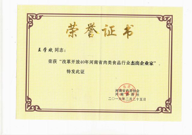 榮譽‖洛陽正大獲評改革開放40年河南肉類食品行業強勢企業、王學斌***總裁榮獲改革開放40年河南肉類食品行業傑出企業家