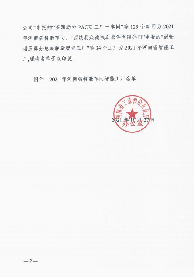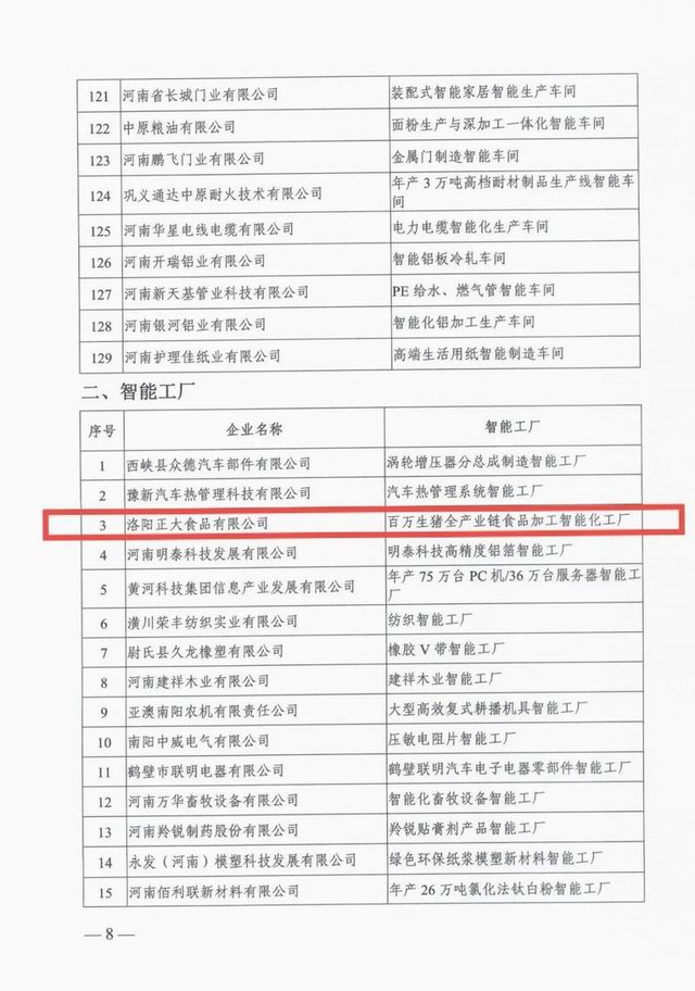 按照《河南省工業和信息化廳辦公室關於(yú)開展2021年度河南省智能車間智能工廠申報工作的通知》(豫工信辦産融〔2021〕163号),經企業志願申報、各地工業和信息化主管部門初審和現場核查、省工業和信息化廳組織專家評審、網上公示,河南省工業和信息化廳確(què)定129個智能車間爲2021年河南省智能車間、34個智能工廠爲2021年河南省智能工廠。2021年10月27日,河南省工業和信息化廳辦公室下發文件《河南省工業和信息化廳辦公室關於(yú)印發2021年河南省智能車間智能工廠名單的通知》(豫工信辦産融【2021】195号)予以公布。洛陽正大獲評2021年河南省智能工廠!