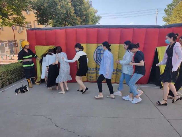 車(chē)間、外圍員工逐個(gè)體驗應急逃生帳篷項目