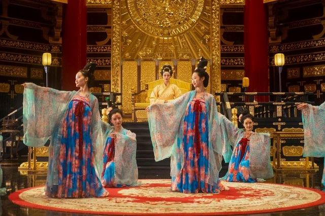 中秋夜遊天堂名堂,大殿載歌載舞,仿佛回到千年前大唐盛世。中秋之日,一群盛裝歌姬白天登阙樓一睹恢弘盛世,傍晚在河邊(biān)放逐水燈許願、思念家鄉,夜晚在華麗的舞台歌舞升平。一派大國盛世、國泰民安的場(chǎng)景。