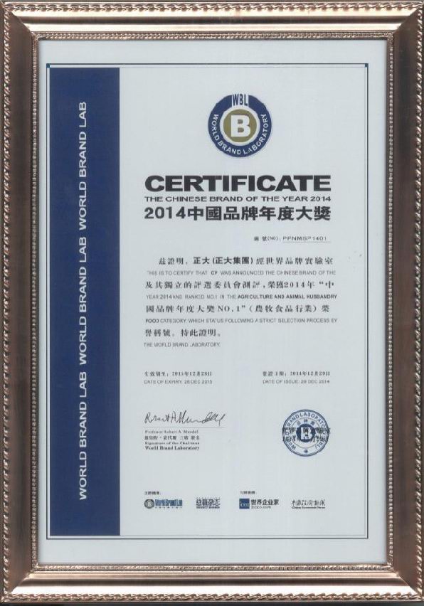 2014年12月29日,“總裁世界年會”在北京東(dōng)方君悅大酒店舉行。本次大會揭曉瞭(le)享有“中國品牌奧斯卡”之稱的 “世界品牌實驗室2014年中國品牌年度大獎”評選結果,正大集團、中國國航、國家電(diàn)網、騰訊控股、中國人壽、中國國旅、北汽集團、華爲技術、長(zhǎng)虹電(diàn)器等30個(gè)活躍在中國(guó)經濟舞台的領軍品牌榮獲 “中國品牌年度大獎”,正大集團以在農牧食品業多年的探索實踐和管理經驗,以及良好的産(chǎn)品品質和品牌知名度,榮獲(huò)農牧食品行業“中國品牌年度大獎***”榮(róng)譽稱(chēng)号。哈佛商學院教授約翰•戴騰博士(John Deighton)、耶魯(lǔ)大學管理學院教授萊(lái)維·多爾博士(Ravi Dhar)分别進行頒獎及緻詞。