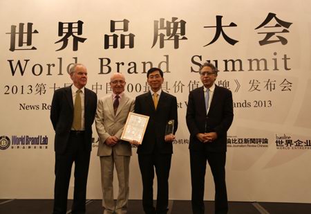 6月26日,由世界品牌實驗室、世界經理人雜志等機構主辦的世界品牌大會暨2013年第十屆《中國500***具價值品牌》發布會在北京東方君悅大酒店召開。會議發布瞭2013第十屆《中國500***具價值品牌》排行榜,正大集團以208.86億元的品牌價值位居第88位。美國耶魯大學管理學院萊維·多爾教授(右一)、法國歐洲工商管理學院瓊·克勞德·拉裏齊教授(左二)以及英國牛津大學商學院斯蒂芬·沃格教授(左一)爲正大集團頒獎。董事長辦公室(北京)楊海浩總裁(右二)代表集團接受獎杯及證書。