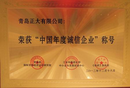 在商務部國際貿易經濟合作研究院、工業和信息化部中小企業發展促進中心、《經濟》雜志社聯合組織的2012年“中國年度誠信企業”評選活動中,青島正大有限公司榮獲“中國年度誠信企業”殊榮。